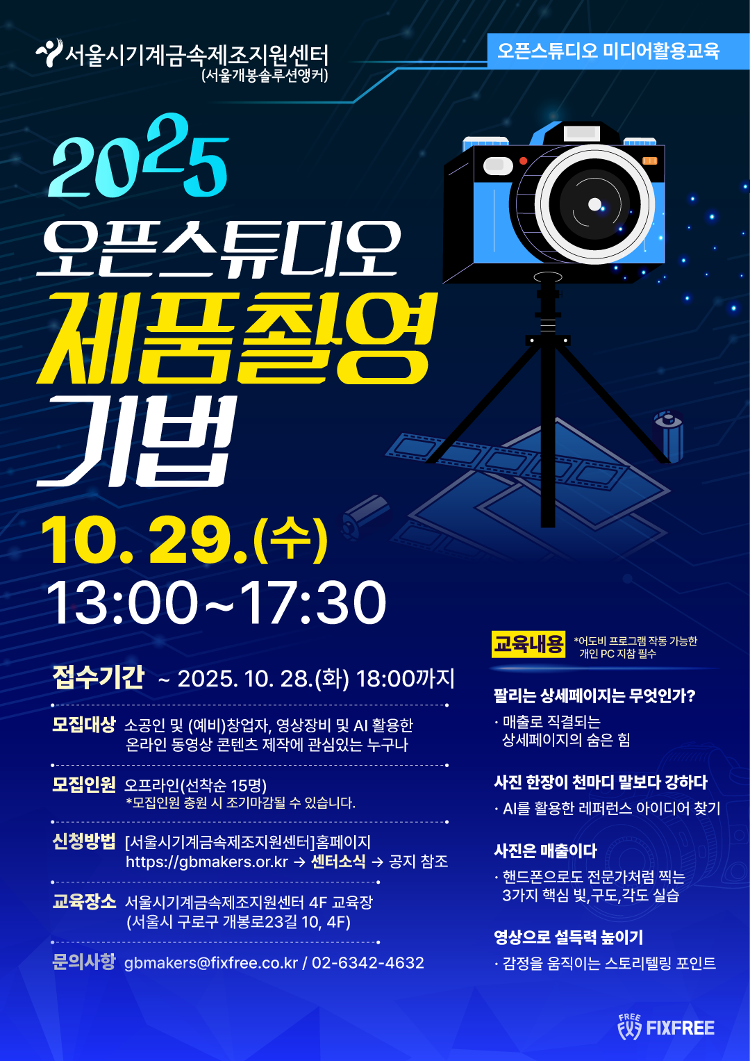 [서울시기계금속제조지원센터]에서오픈스튜디오 미디어활용교육 [제품 촬영 기법 교육]교육생을 모집합니다.서울 지역 (예비)소공인 및 관련 (예비)창업자, 메이커 및 창업에 관심있는 일반인, 학생들의 많은 참여 바랍니다.