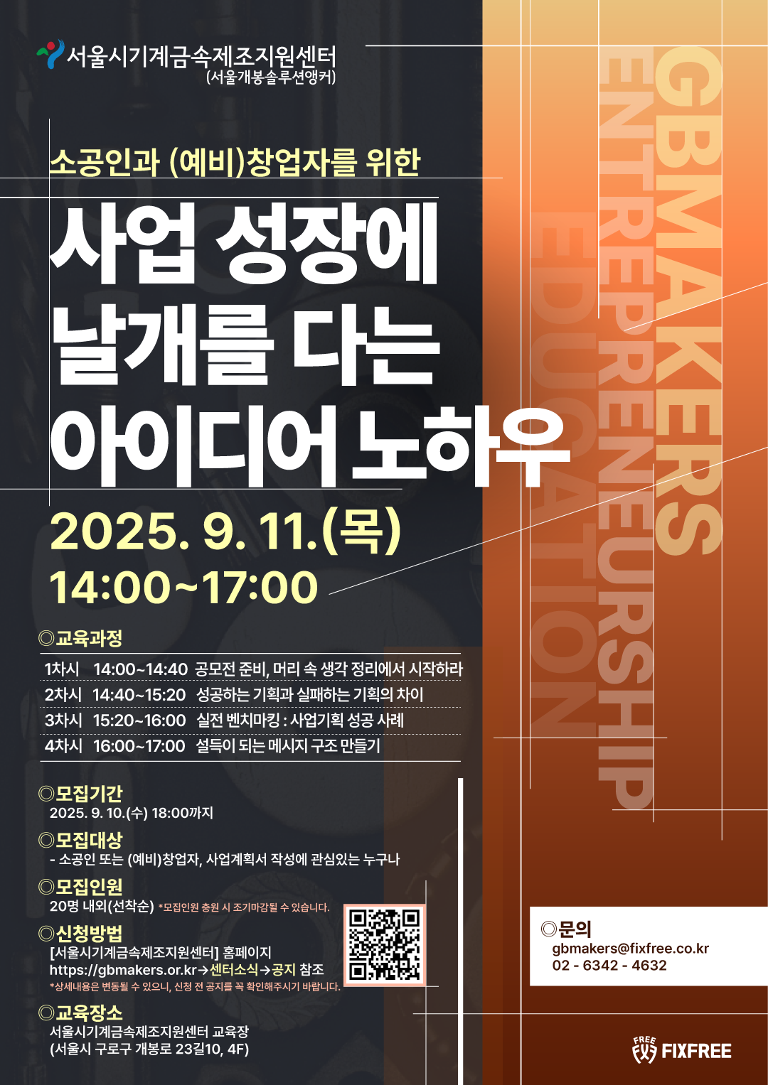 [서울시기계금속제조지원센터]에서소공인과 (예비)창업자를 위한 [사업 성장에 날개를 다는 아이디어 노하우]교육생을 모집합니다.서울 지역 (예비)소공인 및 관련 (예비)창업자, 메이커 및 창업, 사업계획서 작성에 관심있는 일반인, 학생들의 많은 참여 바랍니다.