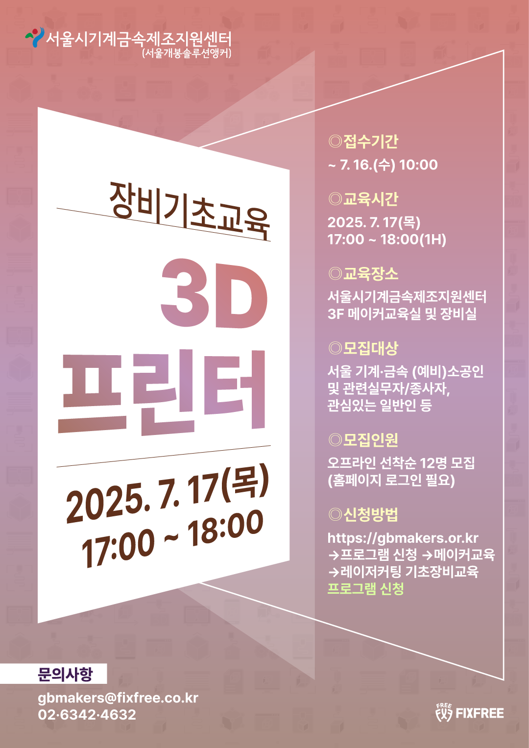 [서울시기계금속제조지원센터]에서장비기초교육 [3D프린터] 7월교육생을 모집합니다.서울 지역 (예비)소공인 및 관련 (예비)창업자, 메이커 및 창업에 관심있는 일반인, 학생들의 많은 참여 바랍니다.