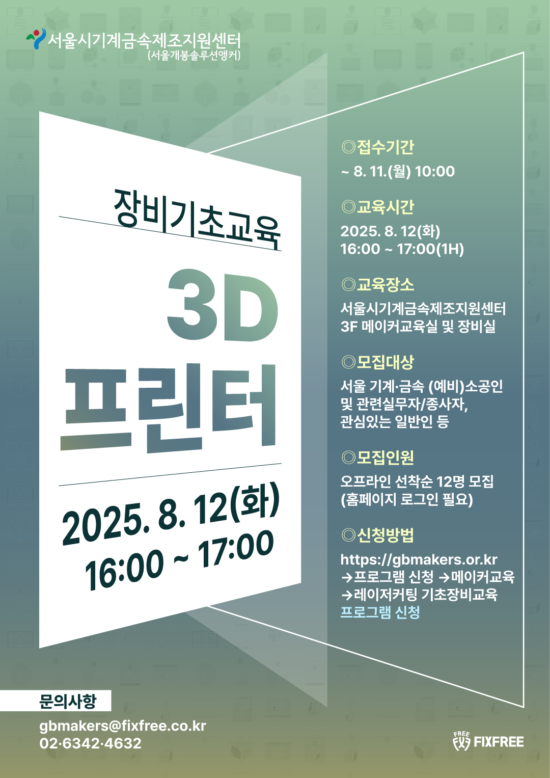 [서울시기계금속제조지원센터]에서장비기초교육 [3D프린터] 8월교육생을 모집합니다.서울 지역 (예비)소공인 및 관련 (예비)창업자, 메이커 및 창업에 관심있는 일반인, 학생들의 많은 참여 바랍니다.
