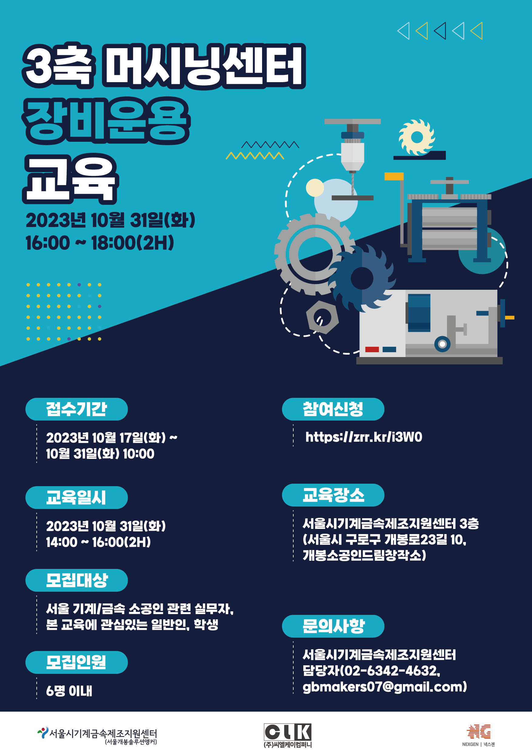 [서울시기계금속제조지원센터]에서 장비기초교육 [3축 머시닝센터 장비운용 교육]교육생을 모집합니다.서울 지역 (예비)소공인 및 관련 (예비)창업자, 메이커에 관심있는 일반인, 학생들의 많은 참여 바랍니다.