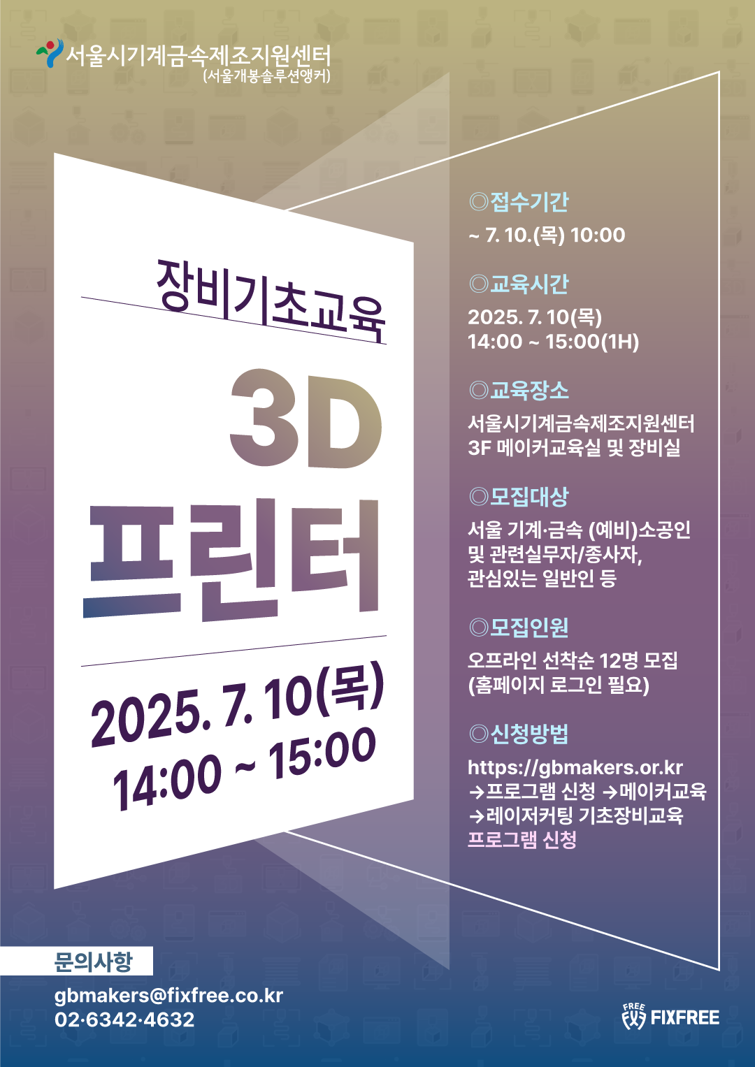 [서울시기계금속제조지원센터]에서장비기초교육 [3D프린터] 7월교육생을 모집합니다.서울 지역 (예비)소공인 및 관련 (예비)창업자, 메이커 및 창업에 관심있는 일반인, 학생들의 많은 참여 바랍니다.