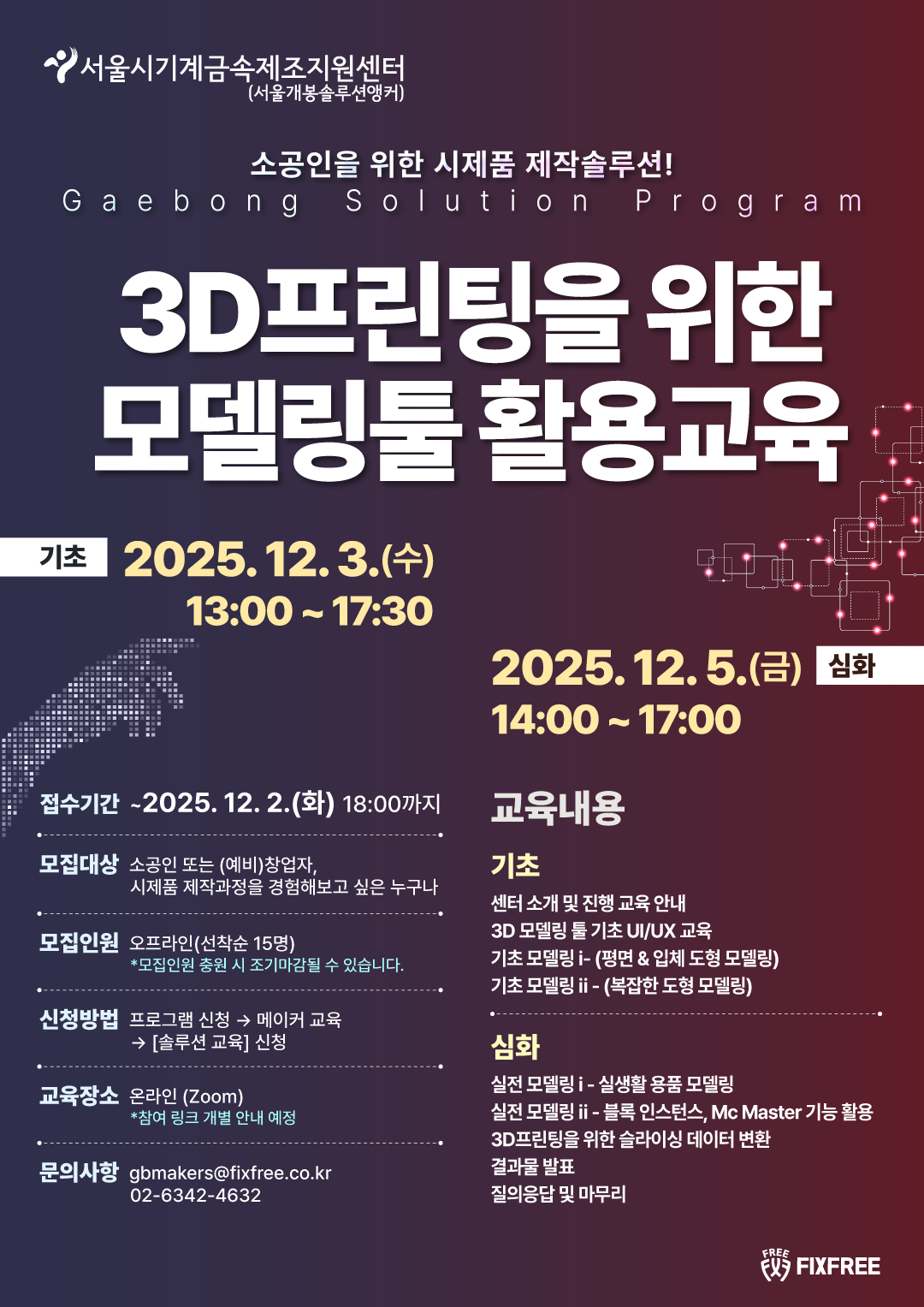 [서울시기계금속제조지원센터]에서소공인을 위한 시제품 제작 솔루션 [3D프린팅을 위한 모델링툴 활용교육]교육생을 모집합니다.서울 지역 (예비)소공인 및 관련 (예비)창업자, 시제품 제작 과정을 경험해 보고 싶은 일반인, 학생들의 많은 참여 바랍니다.