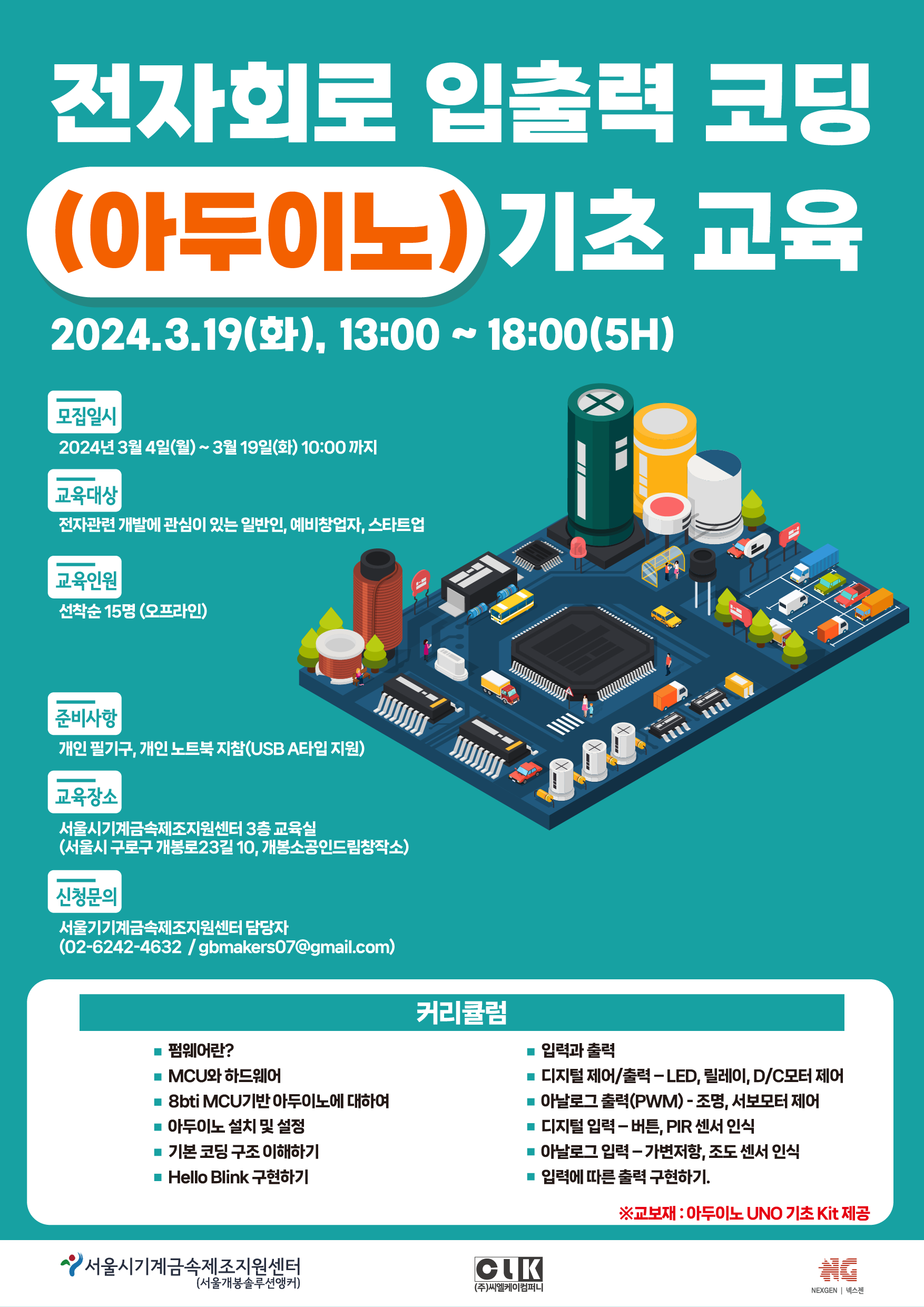 [서울시기계금속제조지원센터]에서 장비기초교육 [전자회로 입출력 코딩(아두이노) 기초]교육생을 모집합니다.서울 지역 (예비)소공인 및 관련 (예비)창업자, 메이커에 관심있는 일반인, 학생들의 많은 참여 바랍니다.