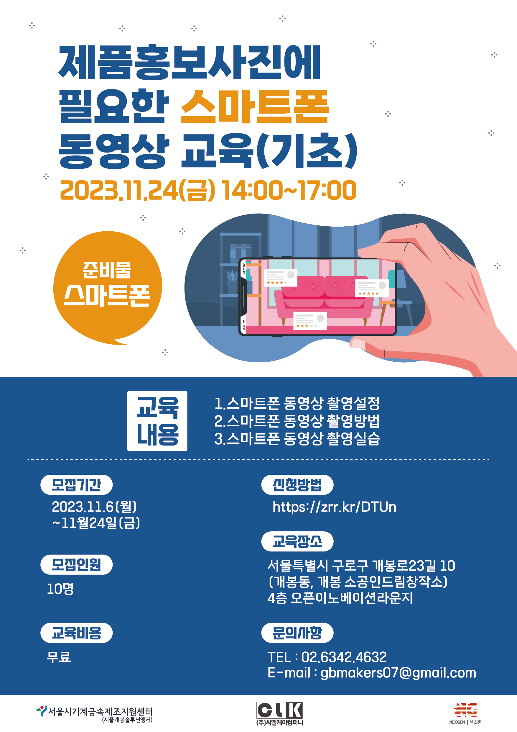 [서울시기계금속제조지원센터]에서 장비기초교육 [제품홍보사진에 필요한 스마트폰 동영상 교육(기초)]교육생을 모집합니다.